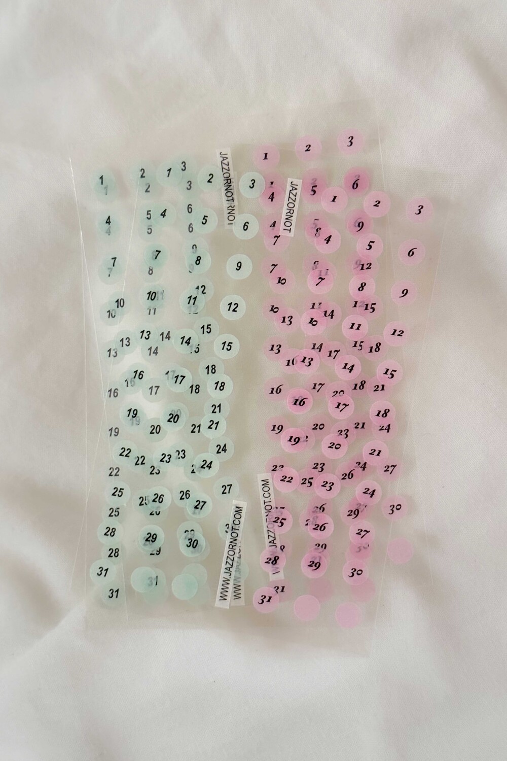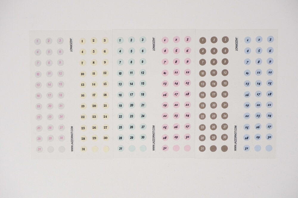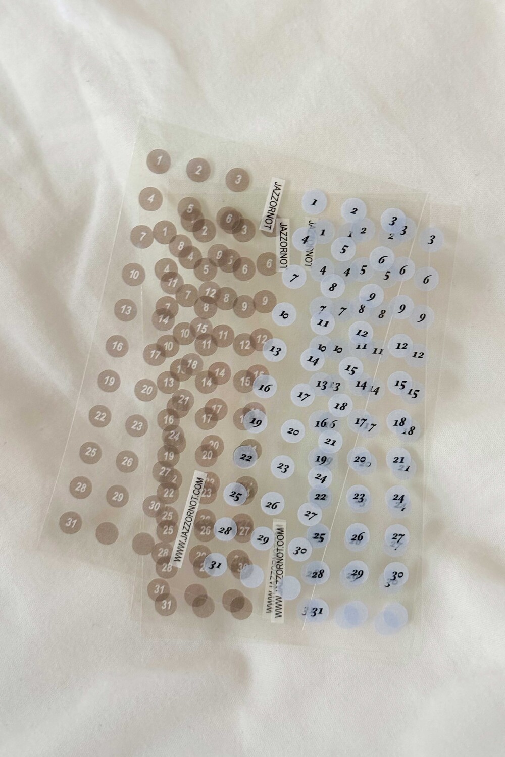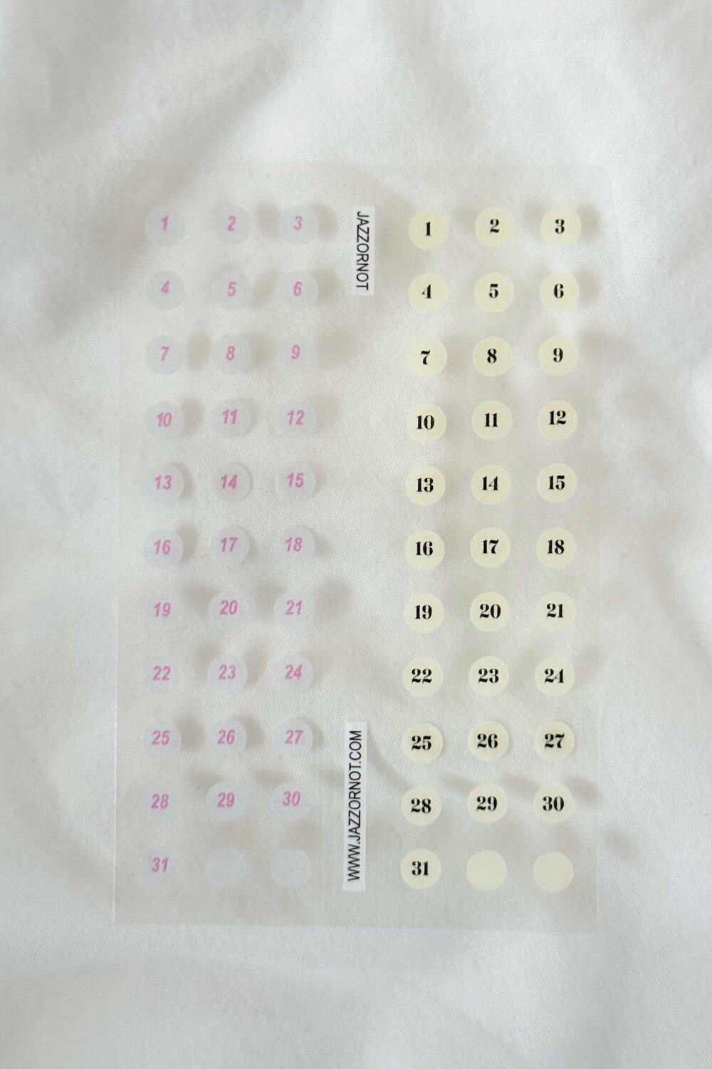 1일부터 31일까지, 매달 다이어리에 날짜를 적어 넣기 힘드셨다면 재즈오어낫의 'Dot the day Sticker'에 주목해주세요. 요일을 잘못 계산해서 잘못 붙여도 괜찮아요! 화지로 제작해 손쉽게 떼어내고 다시 부착할 수 있어요. 한 세트에 6개월분의 숫자 스티커로 구성, 특히 재즈오어낫 다이어리에 최적화된 사이즈랍니다.