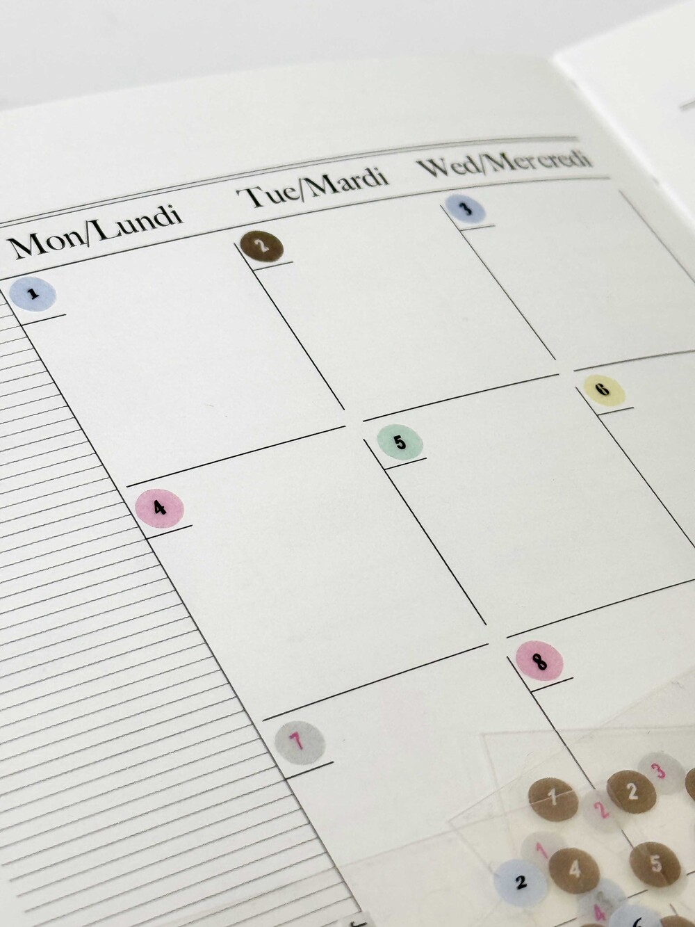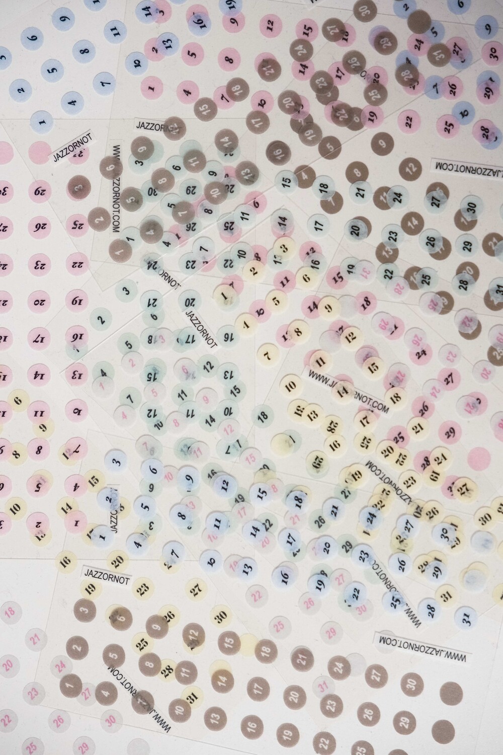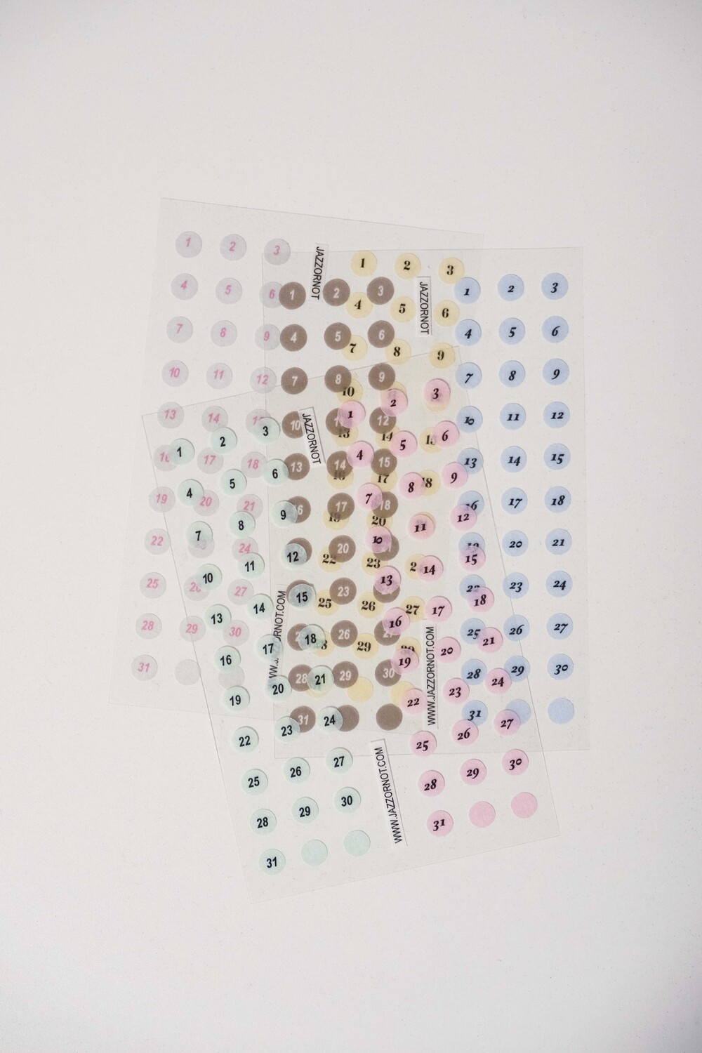 1일부터 31일까지, 매달 다이어리에 날짜를 적어 넣기 힘드셨다면 재즈오어낫의 'Dot the day Sticker'에 주목해주세요. 요일을 잘못 계산해서 잘못 붙여도 괜찮아요! 화지로 제작해 손쉽게 떼어내고 다시 부착할 수 있어요. 한 세트에 6개월분의 숫자 스티커로 구성, 특히 재즈오어낫 다이어리에 최적화된 사이즈랍니다.