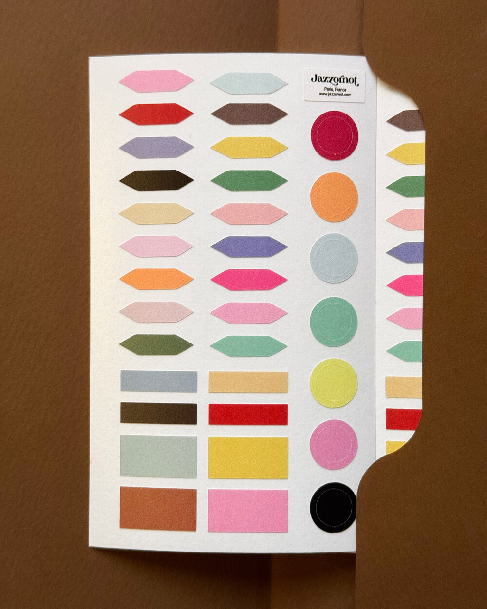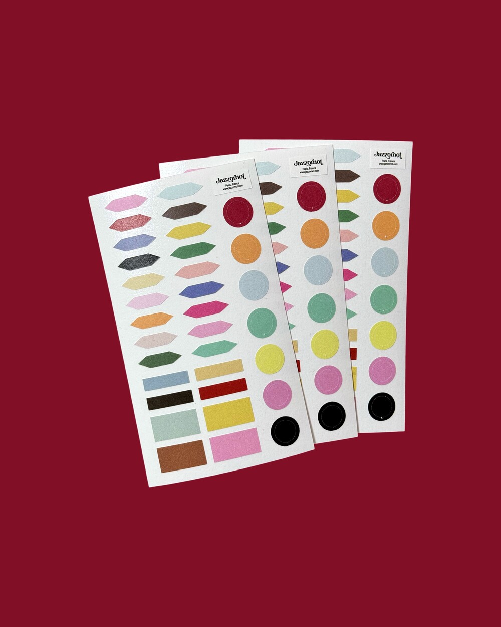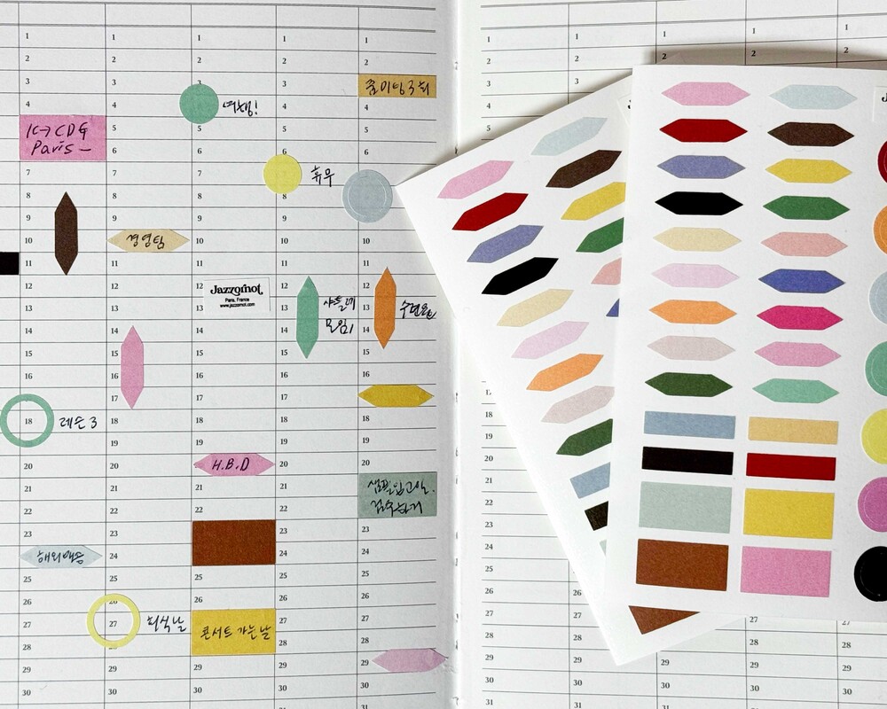 재즈오어낫의 다이어리의 'Calendrier' 페이지와 호환되는 사이즈로 구성된 스케줄 표시용 스티커 세트입니다. 필기 가능한 용지를 사용했으며 총 3장 구성(120조각)으로 넉넉하게 사용할 수 있어요.