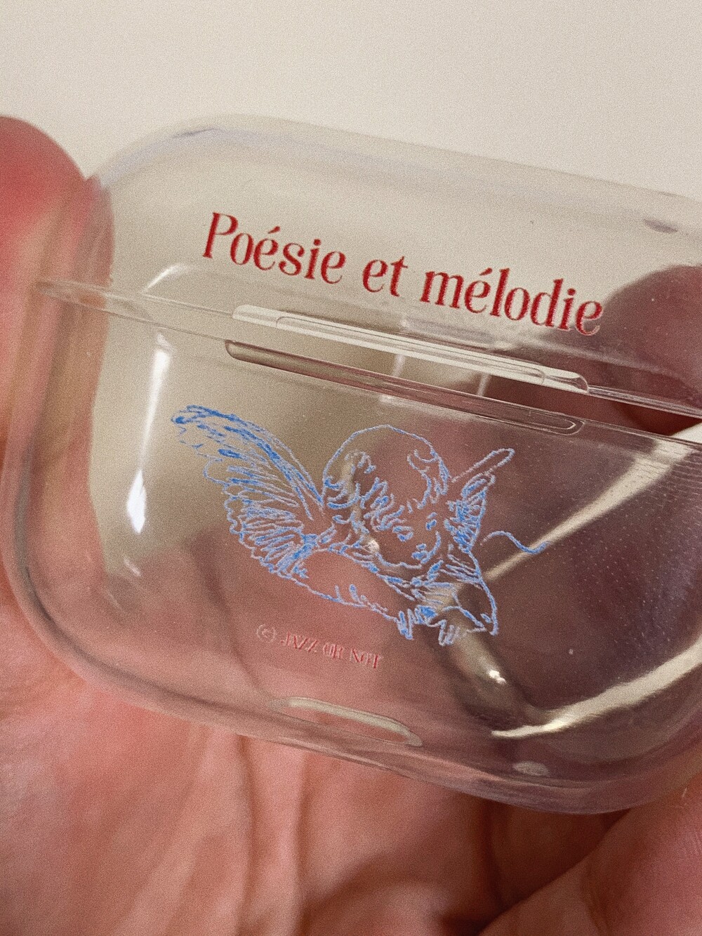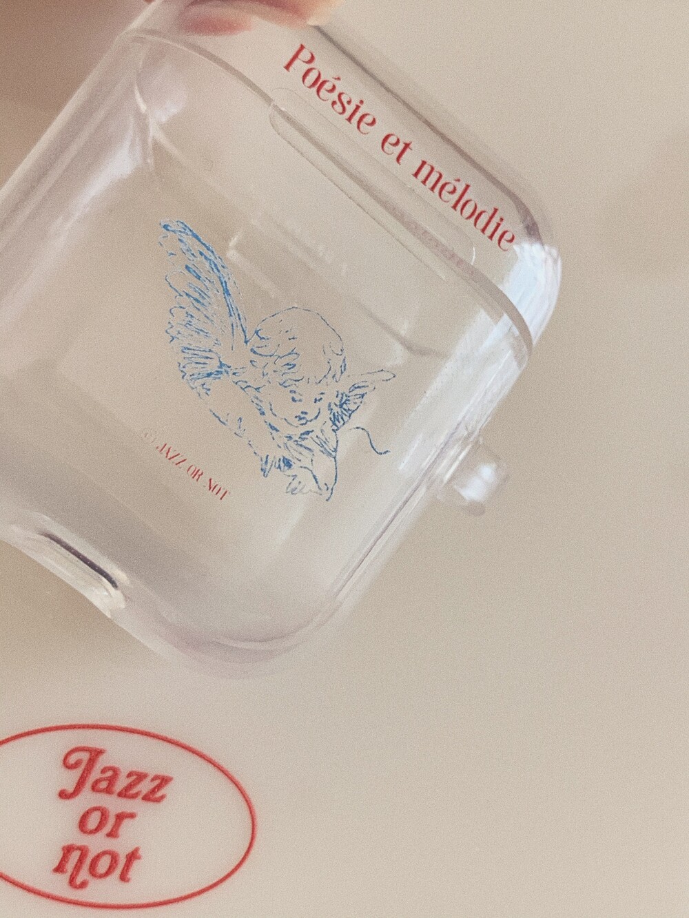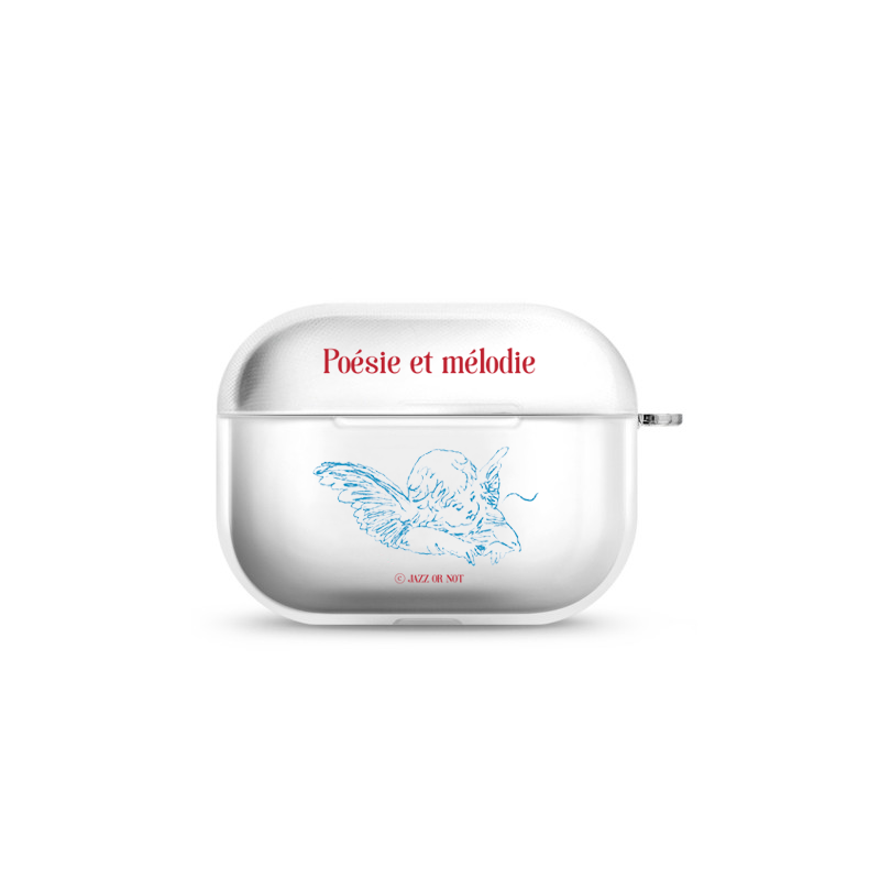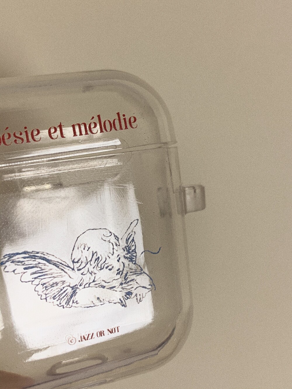 재즈오어낫의 ‘Poésie et Mélodie Air Pods Case’는 프랑스어로 ‘시와 멜로디’ 라는 의미를 담고있습니다. 투명 하드 케이스와 빨간 레터링, 너무 선명하지 않게 그려진 아기천사 일러스트가 빈티지한 무드를 더해줍니다.