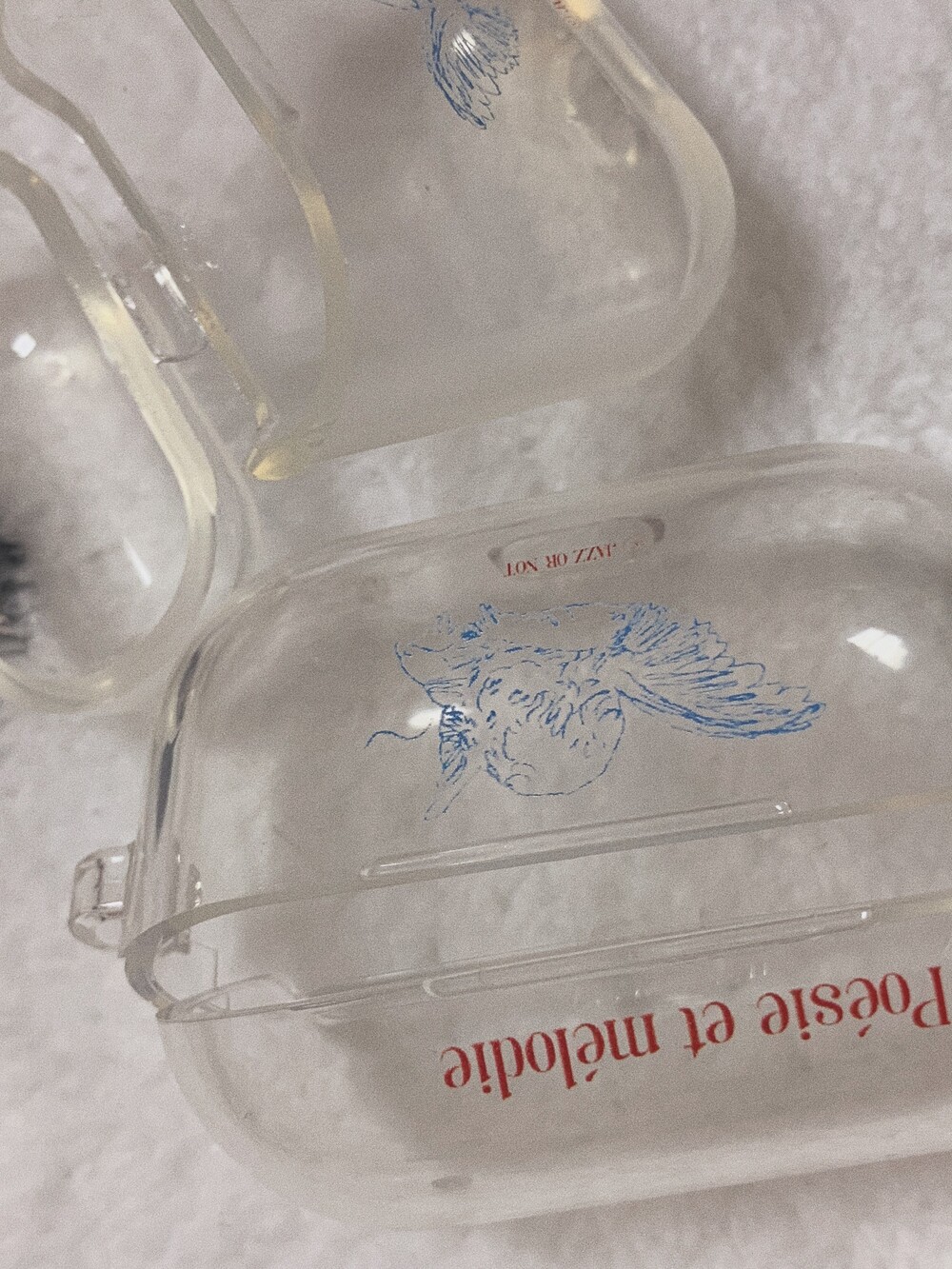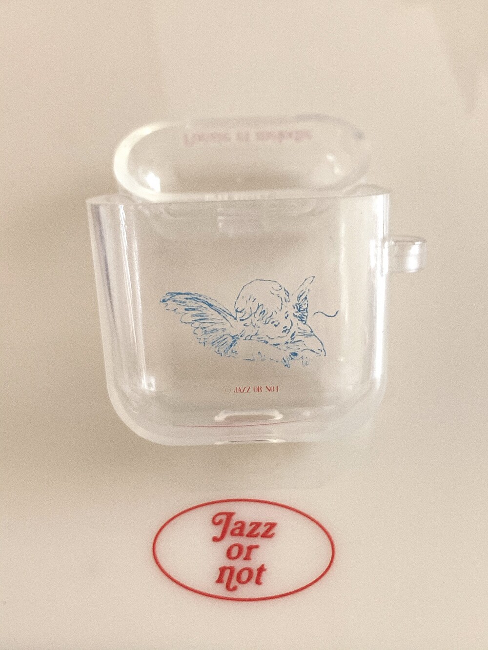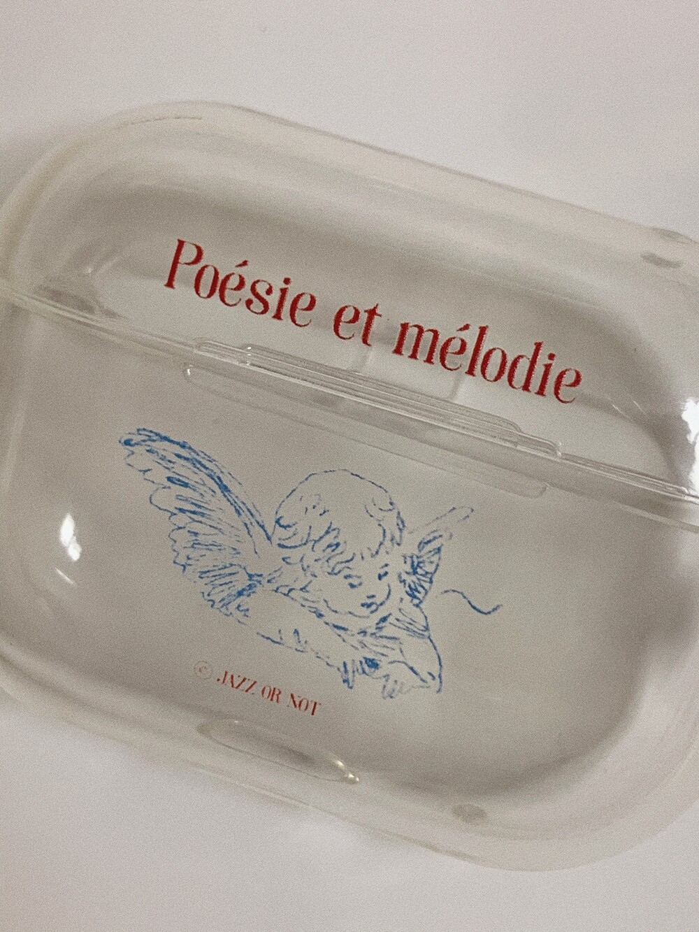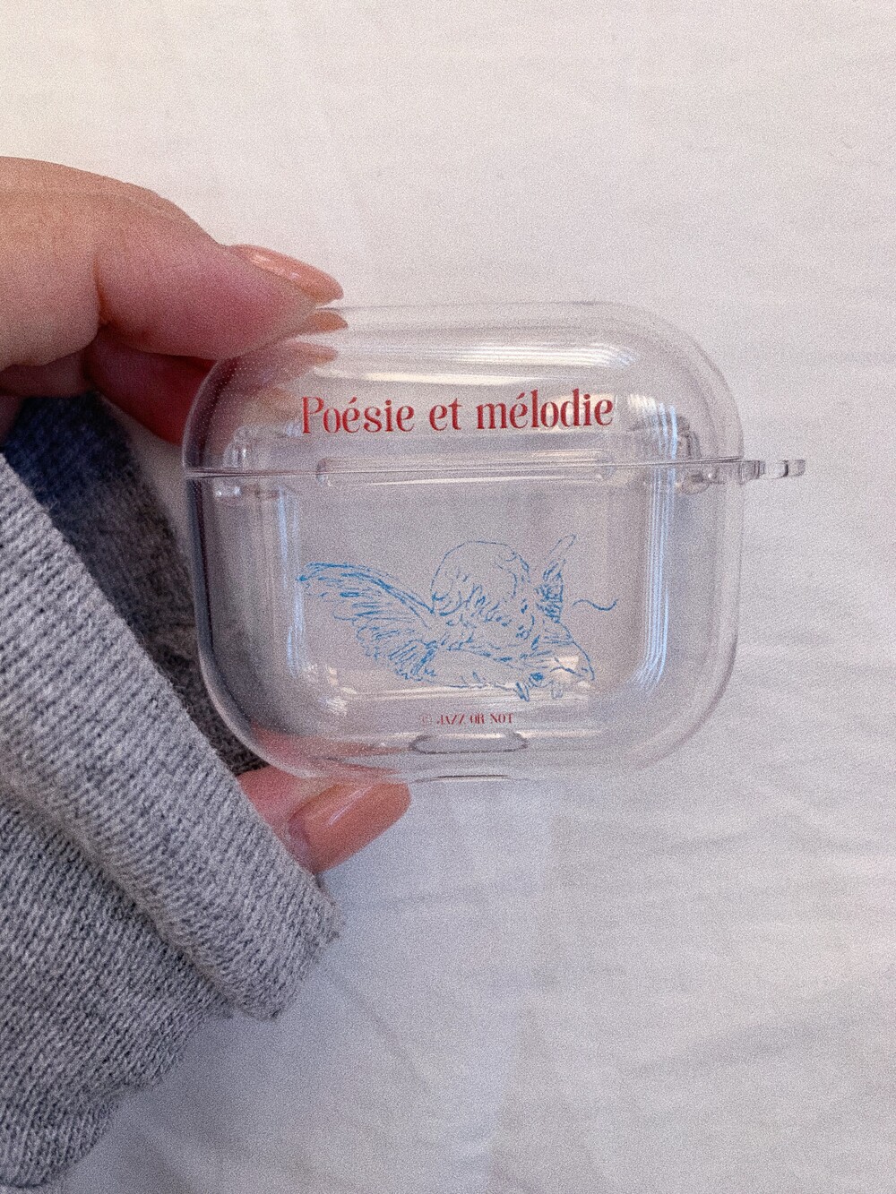 재즈오어낫의 ‘Poésie et Mélodie Air Pods Case’는 프랑스어로 ‘시와 멜로디’ 라는 의미를 담고있습니다. 투명 하드 케이스와 빨간 레터링, 너무 선명하지 않게 그려진 아기천사 일러스트가 빈티지한 무드를 더해줍니다.