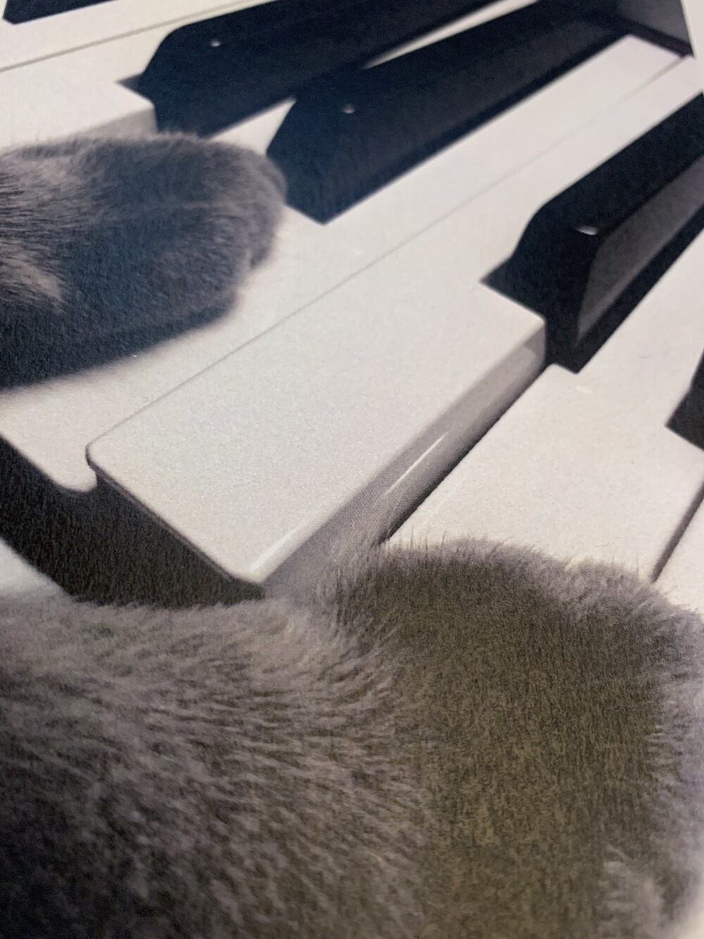 고양이가 'Bebob'을 연주하는 순간을 상상합니다. 피아노 건반을 살포시 누르는 재즈 고양이의 모습입니다.
