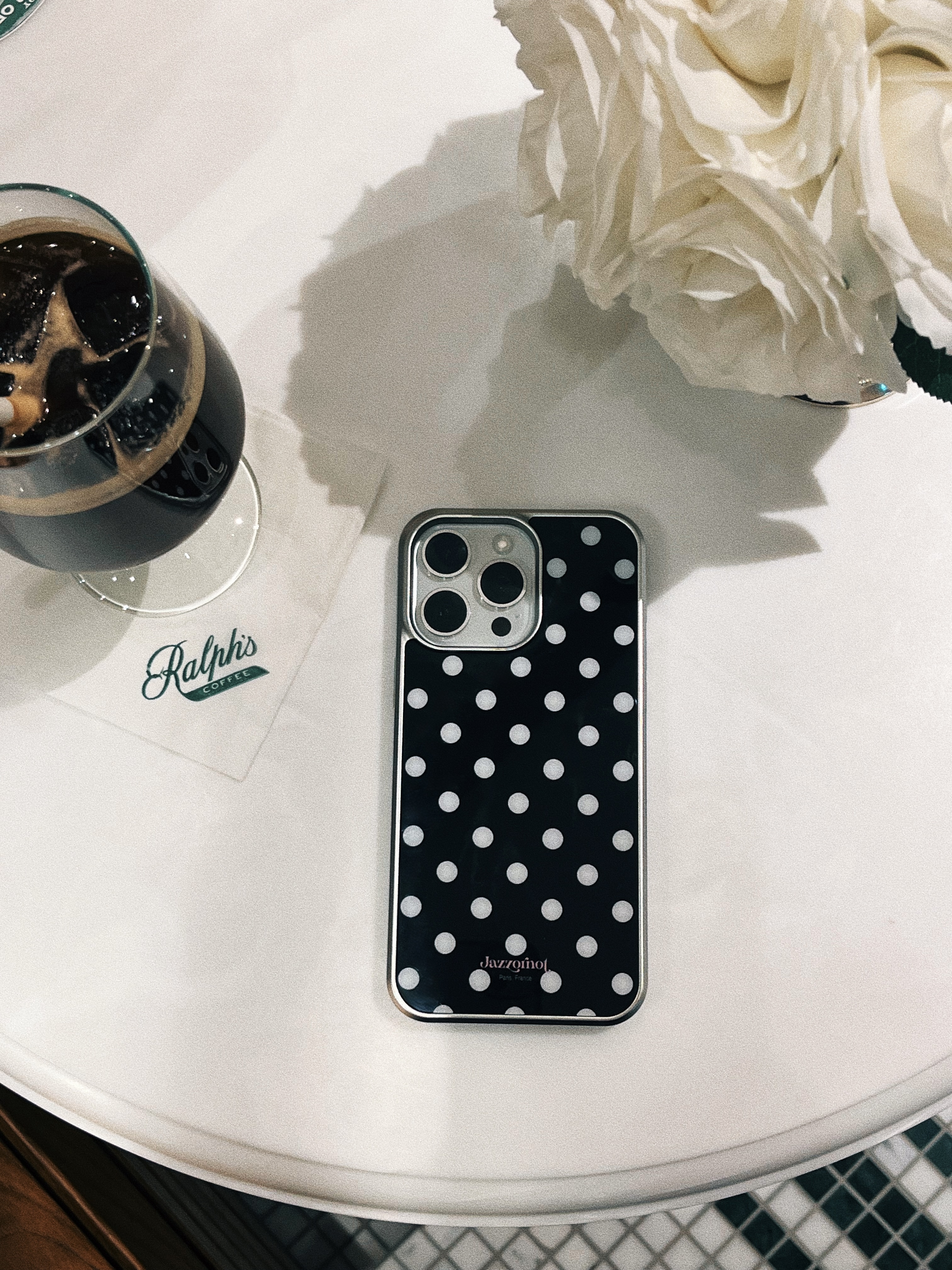 빈티지한 도트 패턴의 보드와 유연한 실버 프레임으로 마감한 폰케이스