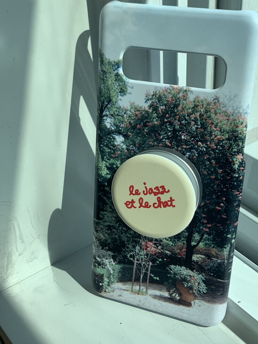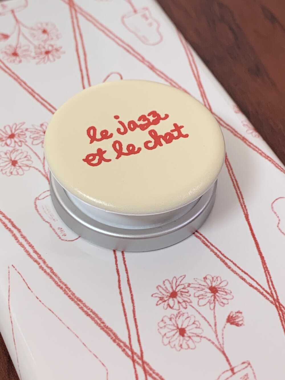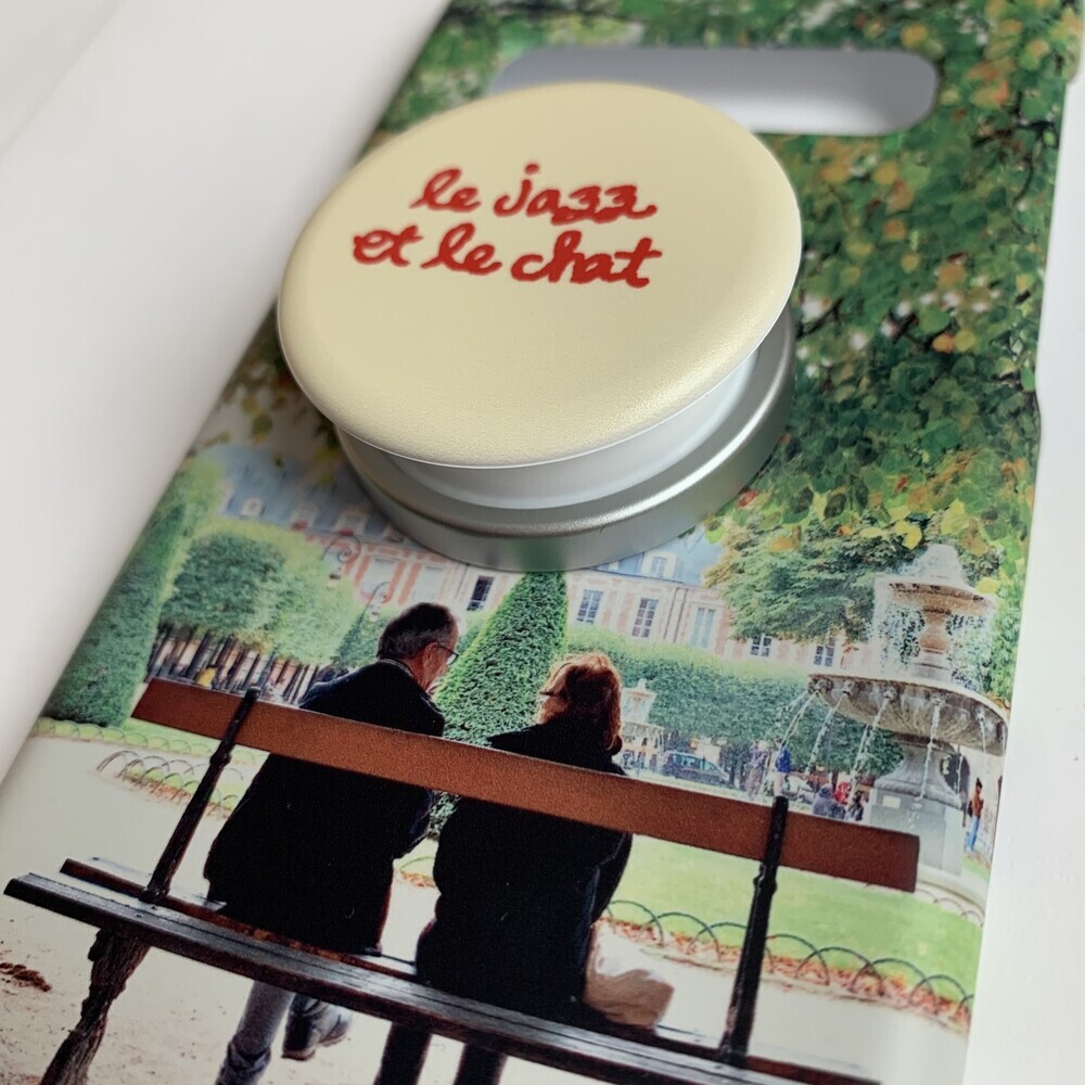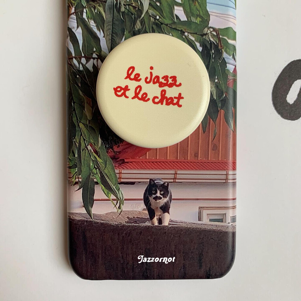 -'재즈와 고양이'를 나타내는 프랑스어 LE JAZZ ET LE CHAT 아이보리 톤으로 다양한 케이스와 자연스럽게 어우러지며, 레드 레터링의 조화가 빈티지한 감성을 전합니다. 하단에는 특별히 은색 링을 배치하여 더욱 특별하고 고급스러운 무드를 선사합니다.