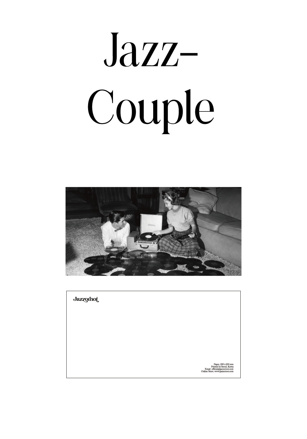재즈레코드를 함께 고르고 듣는 커플의 모습이 담긴 빈티지 필름 엽서. 가로로 긴 형태로, 빈티지한 분위기를 더해줍니다. 좋아하는 재즈를 함께 듣고 싶은 누군가에게 짧은 편지를 써보세요.