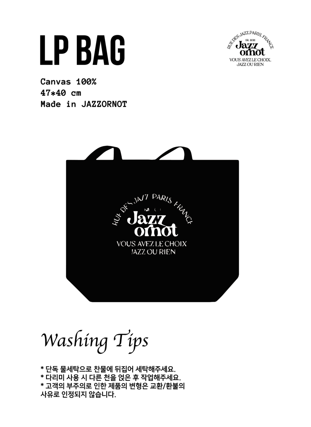두터운 겨울 아우터와도, 짧은 반팔과도 잘 어울리는, 사계절 내내 LP를 사러갈 때 들고 가기 좋은 캔버스 백! 누구보다도 저희가 필요해서 기획 출시하게 된 재즈오어낫의 'LP BAG'입니다. 심플한 로고 디자인과 네이비 컬러로 두고두고 질리지 않게 사용하실 수 있을 거예요. 또한 넉넉한 사이즈로 노트북, 책, 다이어리 등 평소 이것 저것 많은 짐을 챙겨다니시는 분들께 더욱 추천드립니다.