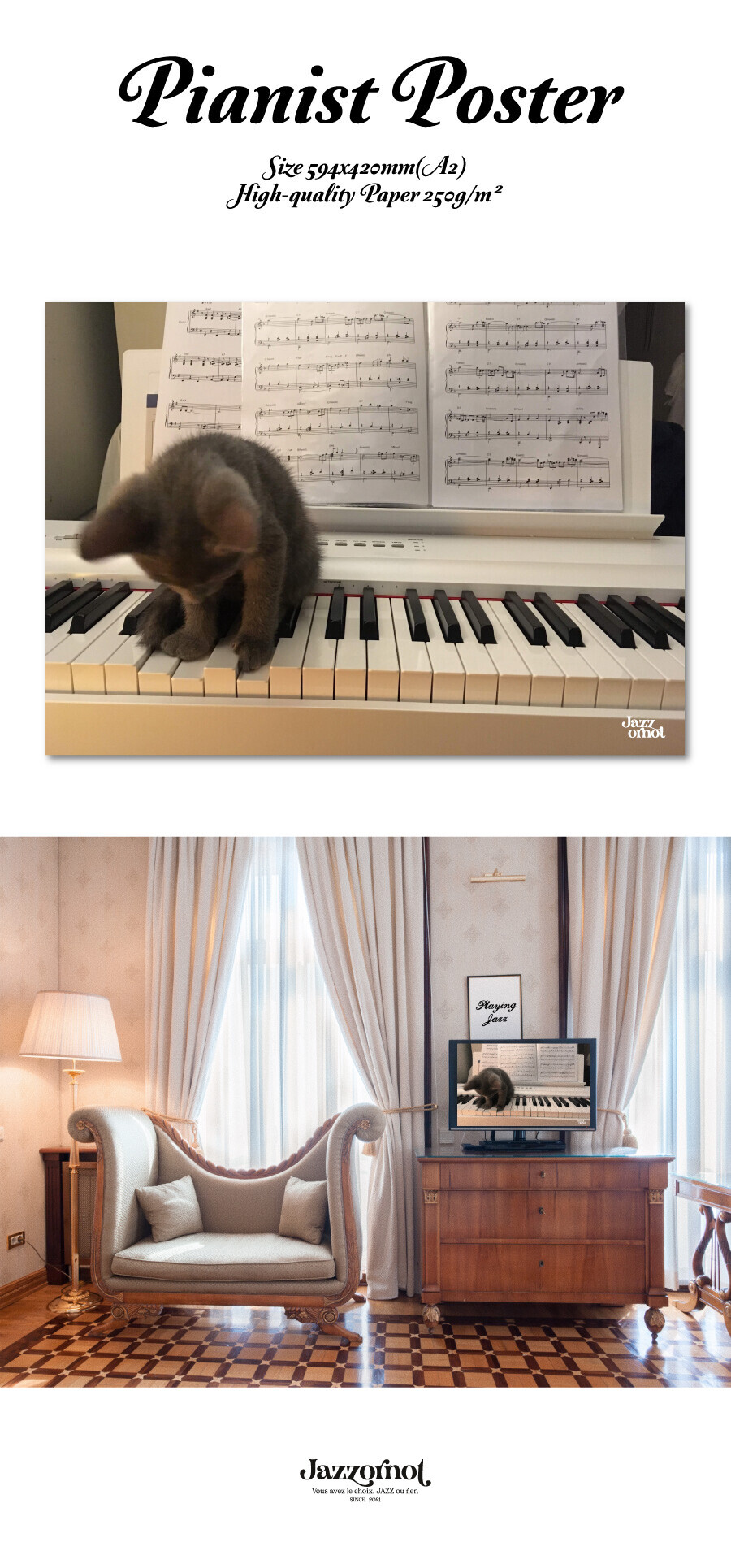 재즈오어낫의 모든 포스터는 탁월한 컬러 구현력과 고급스러운 표면감을 지닌 평량 250g/m²이상 고급 용지에 인쇄됩니다.