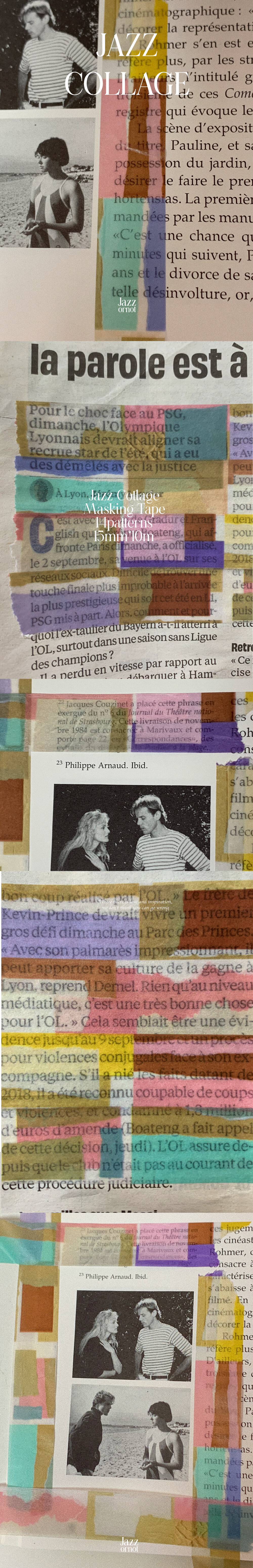 열 네가지 꼴라주 패턴이 연속되는 마스킹테이프. 가위, 풀, 색종이... 많은 재료를 대신해 마스킹테이프 하나로 어디에서나 손쉽게 꼴라주 작업을 해볼 수 있습니다. 나만의 리듬으로!